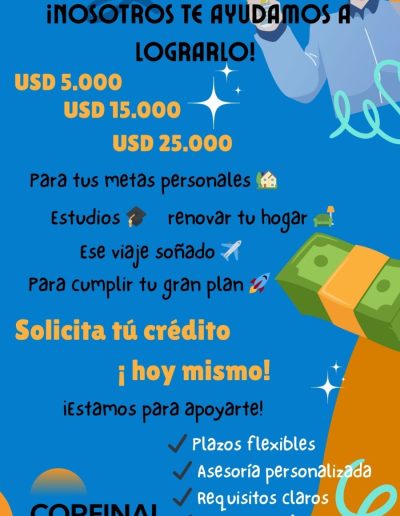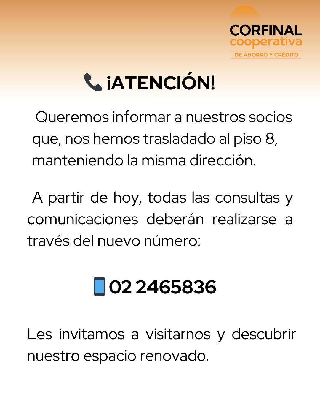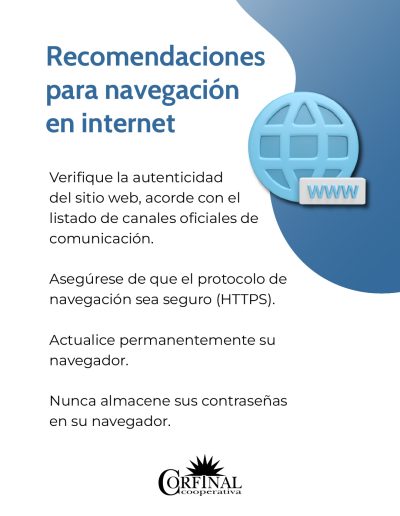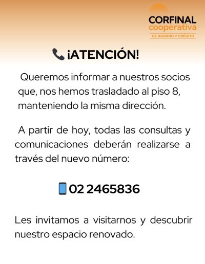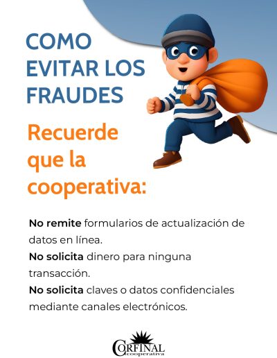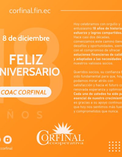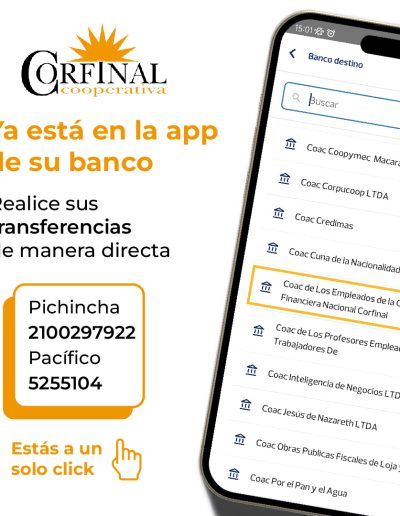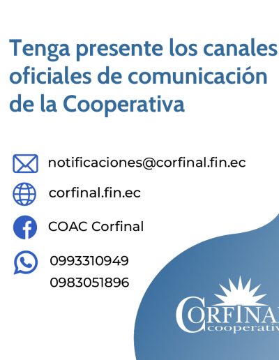 COMUNICACIÓN REFIERE UN SOCIO Y GANA AL INSTANTE CON CORFINAL SOLICITA TU CRÉDITO CORFINAL Canales Oficiales ¿Qué es la Economía Popular y Solidaria? 8M-24 Recomendaciones para Navegar en Internet Ganador Sorteo del Pavo Producto Estrella Nuestros Socios Recibieron su Bono Navideño Aniversario Corfinal Como Evitar Fraudes Ya estamos en la App de su Banco